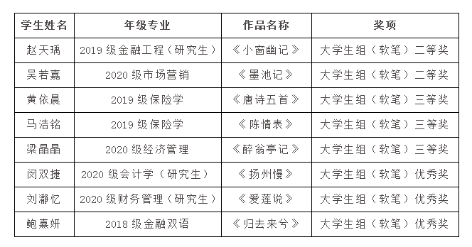 根据活动方案,全省共评选出各类奖项4665个。其中,“笔墨中国”汉字书写大赛四川赛区获奖作品808件,其中软笔类大学生组二等奖22件、三等奖31件、优秀奖42件。我校共有2名学生获二等奖,3名学生获三等奖,3名学生获优秀奖。